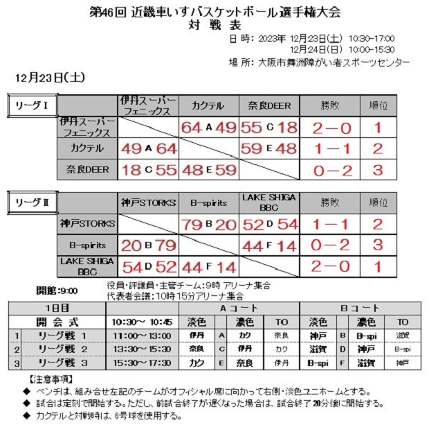 2023年12月23日(土)24日(日) 第46回近畿車いすバスケットボール選手権大会(初日の結果&写真)